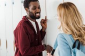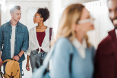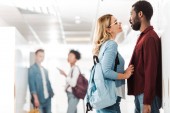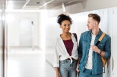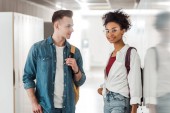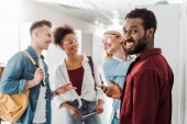 czterech uśmiechniętych wieloetnicznych studentów stojących w korytarzu w kolegium