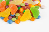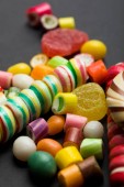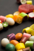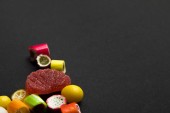 selektywne skupienie pyszne wielobarwne karmelu i galaretki słodycze na czarnym tle
