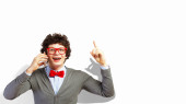 chłopak w okularach czerwony gospodarstwa biały kwadrat