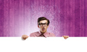 chłopiec szkoły w czerwone okulary gospodarstwa biały kwadrat