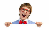 chłopak w okularach czerwony gospodarstwa biały kwadrat