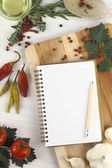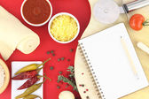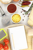 książka kucharska, warzywa i zapiekanka na białym tle