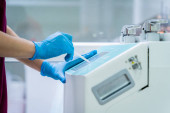 Lekarz dentysta wyjaśnić implantów zębów pacjenta w klinice stomatologicznej.