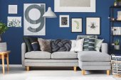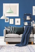 Krzesło wiklinowe obok drewnianego bloku stolik w modnej wnętrza salonu