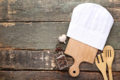 Kapelusz szefa kuchni z deska do krojenia, mąka i przyprawy w słoikach na białym tle