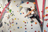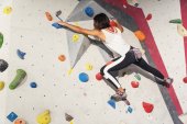 Kobieta wspinaczka wisząca na ściance wspinaczkowej, wewnątrz na kolorowych hakach