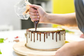Cukiernik wyciera płynną czekoladę z toreb na białą śmietaną ciastko na drewnianej podstawce. Koncepcja domowego ciasta, gotowanie ciasta.
