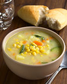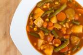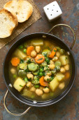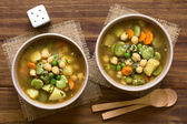 Świeże domowej roboty zupa warzywna z cukinii, seler, marchew, groszek, Fasola biała, zielona fasola, ziemniaki, pomidor, szpinak i makaron zupa ditali serwowane w rustykalnym talerzu zupa (selektywne Focus, fokus w środku zupy)