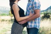Młoda para stojąc razem i tulenie siebie trawiastym boisku w bezchmurne niebo