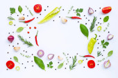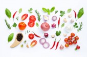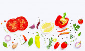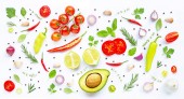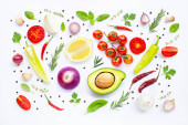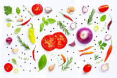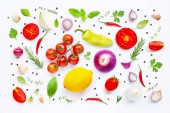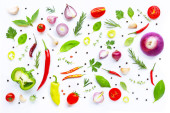 Różnych świeże warzywa i zioła na białym tle.