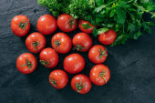 Pomidory rama wokół drewnianej deski do krojenia. Dojrzałe warzywa i kawałek, Zielona pietruszka i koperek w pobliżu kuchni pokładzie i nóż. Sztuka jedzenia