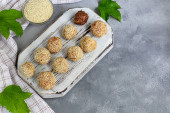 Kulki rybne z warzywami i nasion sezamu na niebieskim talerzu