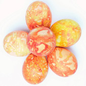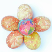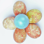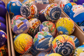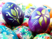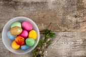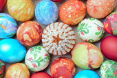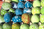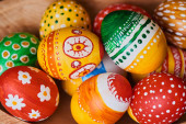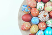 Duży zestaw pisanek w Wiklinowy kosz na białym backgro