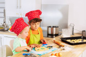 Dzieci dziewczyna i chłopiec w kucharza gotowania kapelusz kucharz w kuchni, Włóż tacę do pieczenia z piernika w piekarniku
