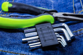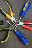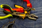 Narzędzia ręczne mistrz elektryk Szczypce do cięcia metalu część na niebieskim tle zbliżenie