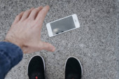 Uszkodzony smartfon z pękniętym szkłem ekranowym stanowi na ziemi Nea