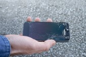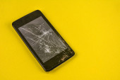 Młoda kobieta podnosi swój zepsuty smartfon z pęknięty ekran a