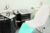 Gabinet kosmetyczny ze stołem do masażu w nowoczesnym salonie piękności. Wnętrze gabinetu lekarskiego.