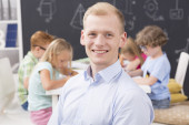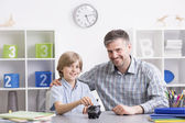 Ojciec i syn siedzi przy biurku na tle pokoju dziecka. Dorosły człowiek pomaga dziecku zrobić pracę domową. Mężczyzna i chłopiec patrząc do aparatu. Szczęśliwy koncepcja relacji Ojca syna