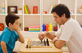 Ojciec i syn gra w szachy na podłodze na tle dziecka pokoju. Dorosły mężczyzna nauczanie dziecko pojęcie