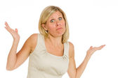 Zbliżenie portret zaskoczony emocjonalna brunetka kobieta z rozwiedzionych rąk, izolowane na białym tle