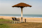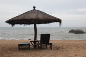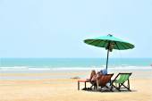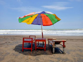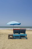 Niebieski parasol nad morzem w piasku, fale, Ocean