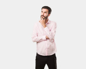 poważny przystojny człowiek stojący z skrzyżowanymi ramionami i patrząc na aparat na białym tle