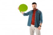 poważny Brodaty mężczyzna trzyma myśli bańki i patrząc na aparat na białym tle