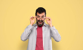 Drażniony człowiek w denim krótki kłótni patrząc na aparat na białym tle