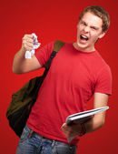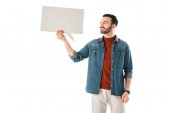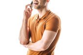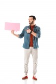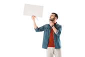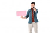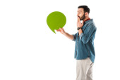 zaskoczony człowiek z bańki mowy trzymając rękę na ustach na białym tle