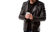 człowiek za pomocą smartfona stojąc z ręką w kieszeni na białym tle
