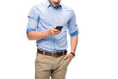 częściowy widok dorosłego mężczyzny w koszulce dżinsowej przy użyciu smartfona na białym tle