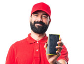 Zdjęcie "wesoły przystojny mężczyzna trzyma smartfon z pustym ekranem i patrząc na aparat na białym tle" może być wykorzystywane do celów osobistych i komercyjnych zgodnie z warunkami zakupionej licencji Royalty-free. Obraz jest dostępny do pobrania w jakości wysokiej rozdzielczości do 5760x3840.