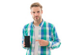 częściowy widok dorosłego mężczyzny trzymania smartfona z pustym ekranem na białym tle