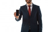 zamyślony Brodaty mężczyzna patrząc podczas trzymania cyfrowego tabletu z pustym ekranem na białym tle