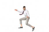 szczęśliwy biznesmen z Aktówka skoki i uśmiechnięty izolowane na białym