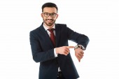 wesoły przystojny operatora Call Center w zestawie słuchawkowym pokazując środkowy palec i patrząc na aparat na białym tle