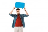zniechęceni biznesmen pokazując wzruszyć gest i patrząc na bańki mowy na białym tle