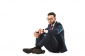 biznesmen dotykając na białym tle przystojny szczęśliwy uśmiechający się