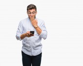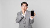 zaskoczony biznesmen gospodarstwa cyfrowego tablet z pustym ekranem i obejmujące usta z ręki izolowane na białym