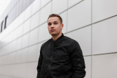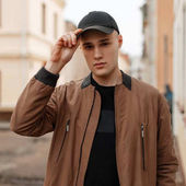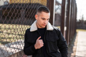 Zdjęcie "Miejski młody człowiek w stylowych tenisówki w zabytkowych spodniach w modnej czarnej kurtce siedzi na drewnianym tarasie letniej kawiarni w mieście w dniu wiosny. Atrakcyjny nowoczesny facet lubi weekend." może być wykorzystywane do celów osobistych i komercyjnych zgodnie z warunkami zakupionej licencji Royalty-free. Obraz jest dostępny do pobrania w jakości wysokiej rozdzielczości do 5760x3840.