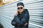 Zdjęcie "Przystojny nowoczesny młody człowiek w niebieskie stylowe dżinsy w modnej czarnej kurtki z białym futro spoczywa stoi w pobliżu szarej ściany rocznika w mieście. Amerykański atrakcyjny facet. Modne ubrania męskie." może być wykorzystywane do celów osobistych i komercyjnych zgodnie z warunkami zakupionej licencji Royalty-free. Obraz jest dostępny do pobrania w jakości wysokiej rozdzielczości do 5760x3840.