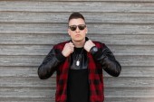 Radosny atrakcyjny młody człowiek w stylu Vintage czarna kurtka w stylowej t-shirt z modną fryzurę stwarzając stojący w pobliżu ściany w pomieszczeniu. Miejski nowoczesny facet. Stylowa odzież męska.