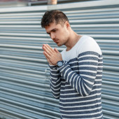 Zdjęcie "Cute nowoczesny młody człowiek ze stylową fryzurę w stylu Vintage niebieskie dżinsy w modnej czarnej kurtki z białym kołnierzem stoi w pobliżu ściany w mieście na zewnątrz. Przystojny facet model. Ulica casual styl." może być wykorzystywane do celów osobistych i komercyjnych zgodnie z warunkami zakupionej licencji Royalty-free. Obraz jest dostępny do pobrania w jakości wysokiej rozdzielczości do 5760x3840.