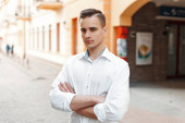 Cool młody człowiek z modną fryzurę w modnej czarnej kurtki w T-shirt stwarzające stojący w pobliżu okna nowoczesnego budynku w mieście. Miły facet na ulicy. Stylowa odzież męska.