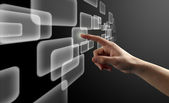 Ręka człowieka naciskając przycisk. Ekran dotykowy. Widok z tyłu.