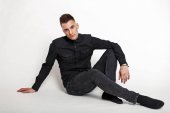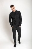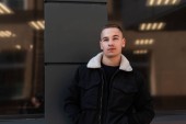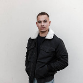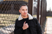 Zdjęcie "Europejski przystojny młody człowiek w modnej czarnej kurtki z białym futerkiem w stylowym czarnym t-shirt stoi w pobliżu szarej ściany na zewnątrz. Atrakcyjny model faceta. Ulica casual styl." może być wykorzystywane do celów osobistych i komercyjnych zgodnie z warunkami zakupionej licencji Royalty-free. Obraz jest dostępny do pobrania w jakości wysokiej rozdzielczości do 5760x3840.