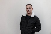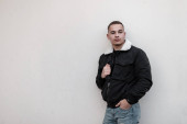 Europejski przystojny młody człowiek w modnej czarnej kurtki z białym futerkiem w stylowym czarnym t-shirt stoi w pobliżu szarej ściany na zewnątrz. Atrakcyjny model faceta. Ulica casual styl.