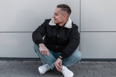 Radosny młody człowiek w modnej odzieży wiosennej w skórzanych, białych trampki stwarzających siedzi na chodniku w pobliżu nowoczesnego budynku w mieście w dniu wiosny. Szczęśliwy model facet cieszy się weekend.