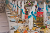 piękne kieliszki do szampana ozdobione niebieskimi kwiatami.